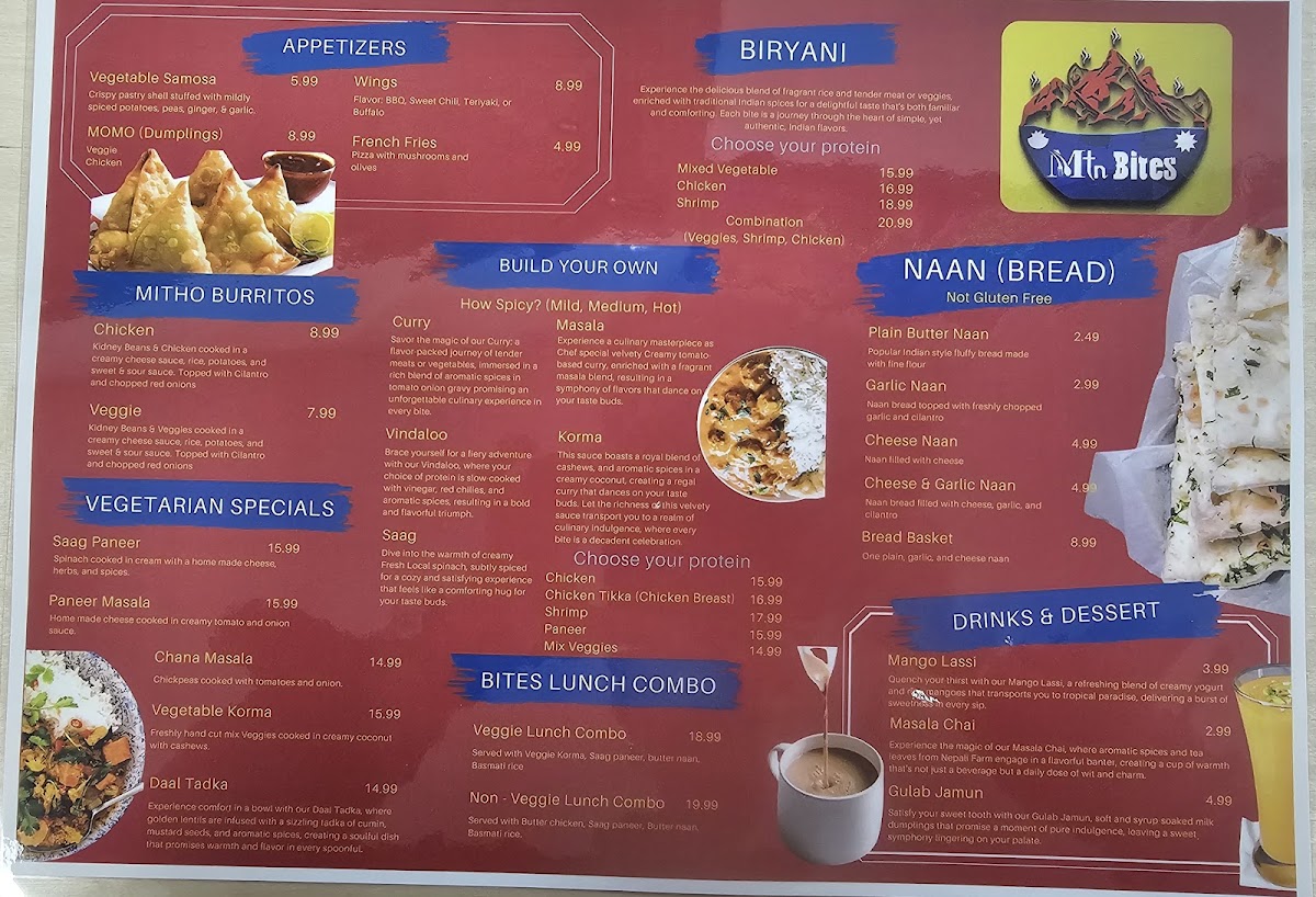 Mountain Bites is a celebration of rich culinary traditions, featuring an enticing menu that caters to both Indian and Nepali palates. One standout item is their Mitho Burrito, available in both chicken and veggie options. Wrapped in butter naan and filled with hearty ingredients like kidney beans, creamy butter chicken, or veggie masala, this dish is rich, flavorful, and utterly satisfying. Priced affordably at $8.99 and $7.99 respectively, it's a must-try for anyone seeking comfort food with a twist.